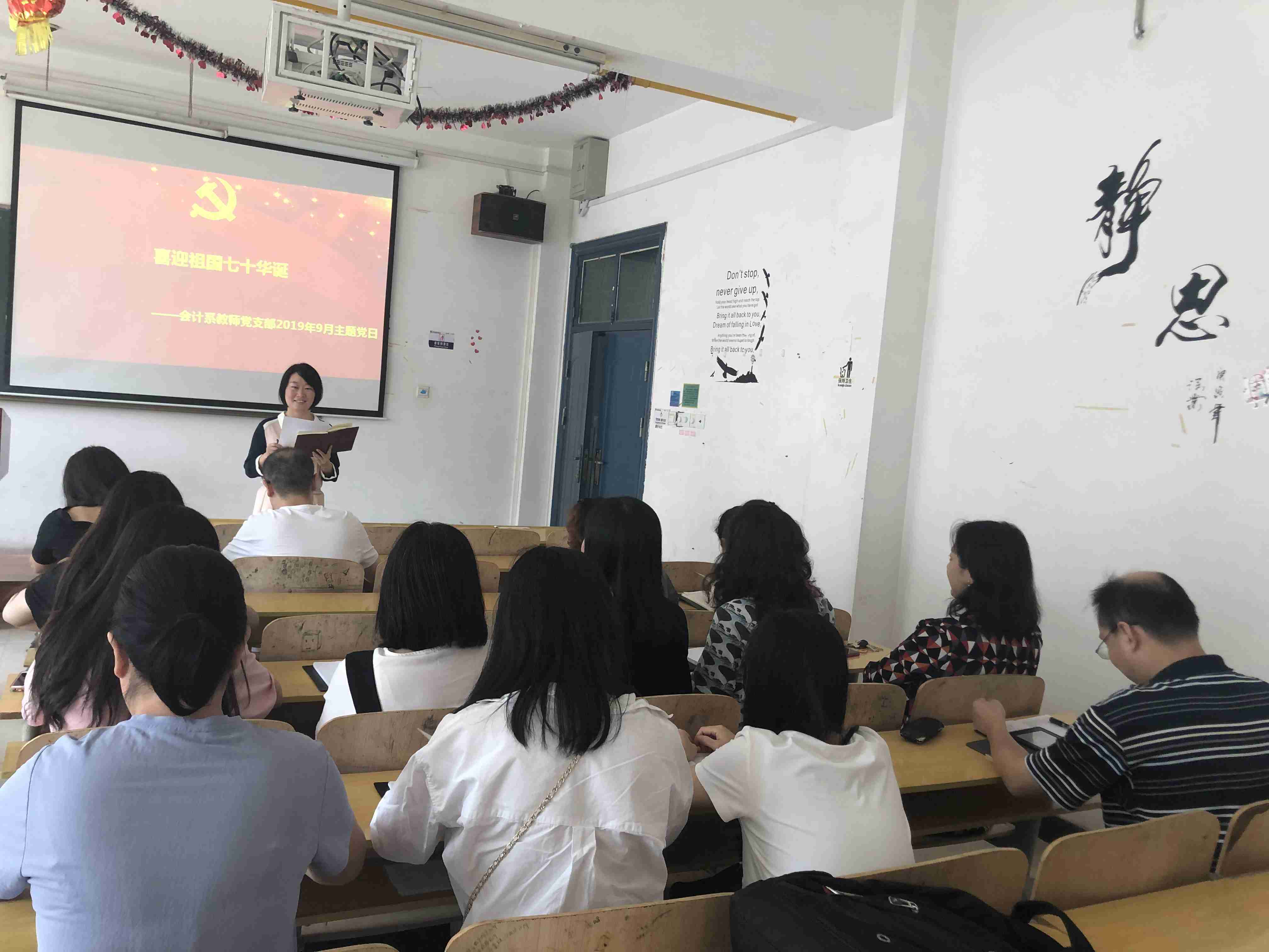 2019年9月25日下午13点,西区四楼54教室召开了“喜迎新中国七十华诞”支部主题党日活动,会议由杜敏同志主持, 会计系教师党支部全体党员参加此次会议。
