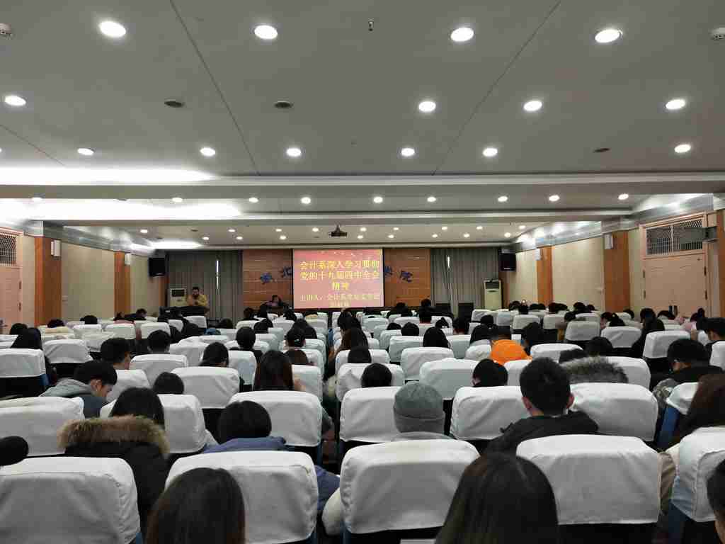 为了深入学习贯彻党的十九届四中全会精神,帮助大家更加深刻地理解党中央作出的坚持和完善中国特色社会主义制度、推进国家治理体系和治理能力现代化的战略部署,进一步增强“四个意识”,坚定“四个自信”,做到“两个维护”,提高在思想上政治上行动上同以习近平同志为核心的党中央保持高度一致的思想自觉、政治自觉和行动自觉。2019年12月18日下午在西区学术报告厅,会计系师生济济一堂,会计系党总支书记阳前林同志为会计系师生作了一场以“国家制度与国家治理,中国迈向现代化的重要保障”为主题的报告。参加宣讲会的有会计系全体辅导员、会计系全体党员学生、以及会计系各年级的学生代表,宣讲会由会计系党总支宣传委员,团总支书记甘应方同志主持。