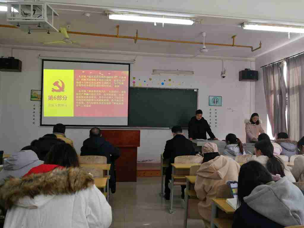 会议开始,全体起立,奏唱国歌;由陶润宇同志带领大家重温入党誓词;随后,由李娟同志现场通报十二月份党支部主题活动到场人员情况和十二月份党费交纳情况。紧接着,由曾欣怡同志诵读党章(第八章党的纪律检查机关)、李玲和曾转虹同志分别带领大家学习《习近平新时代中国特色社会主义思想三十讲》的第十六讲和第十七讲。