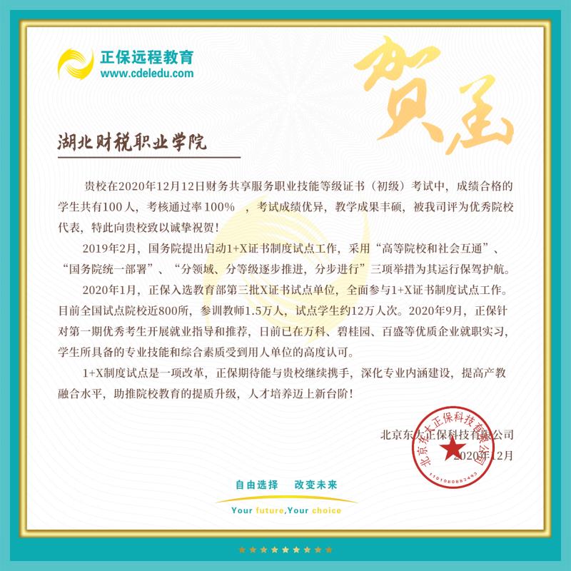 在取得优异成绩的同时,湖北财税职业学院还被此次考试的评价组织单位北京东大正保科技有限公司评为“优秀院校代表”,这是对于师生们的辛苦付出与努力的充分肯定!会计系将充分利用1+X证书制度试点工作,将1+X证书制度试点与人才培养方案修订、课程标准修订、教师队伍培训、教学改革等工作紧密融合,推动学院加速课程体系的改革、加快人才培养的步伐,为切实提升会计相关专业人才培养质量,深化人才培养模式和评价方法改革而努力。