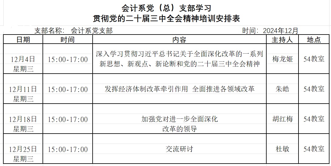 为深入学习贯彻党的二十届三中全会精神,会计系党总支部根据学院总体要求,组织开展了以“学习贯彻党的二十届三中全会精神”为主题的培训活动。