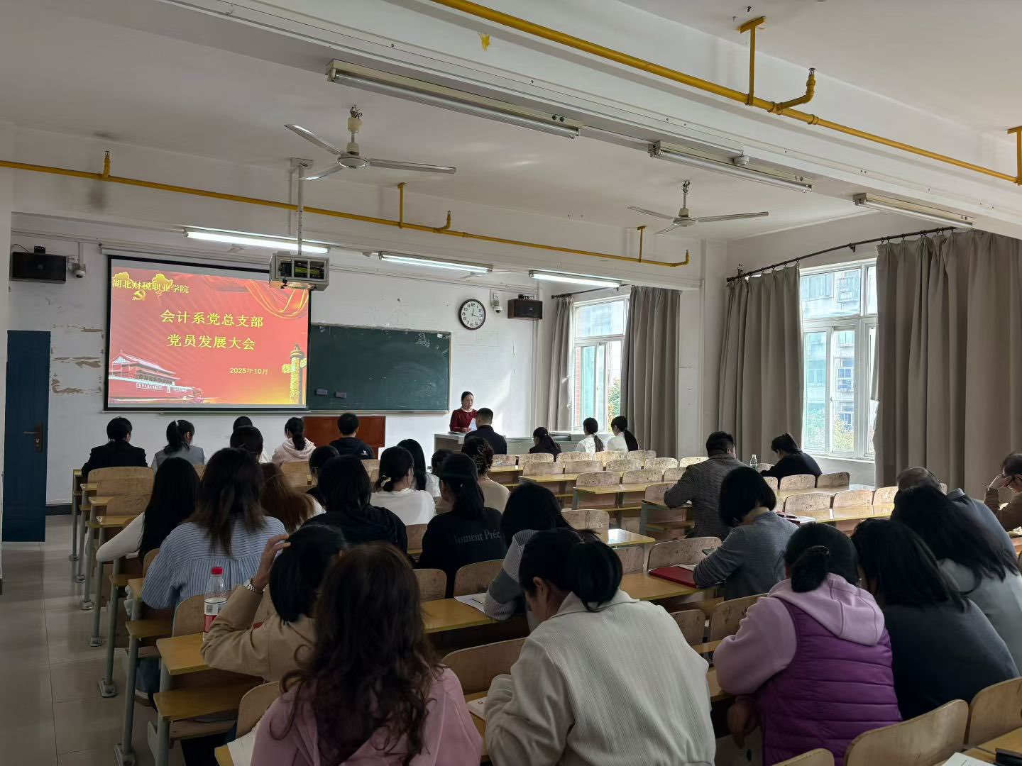 为进一步增强基层党组织的力量,加强党员队伍建设,为党组织注入新鲜活力,2025年10月29日下午,在求知楼54教室会计系召开党员发展及转正大会,本次大会由会计系学生党支部组织委员杜银蝶同志主持,会计系全体师生党员参加会议。
