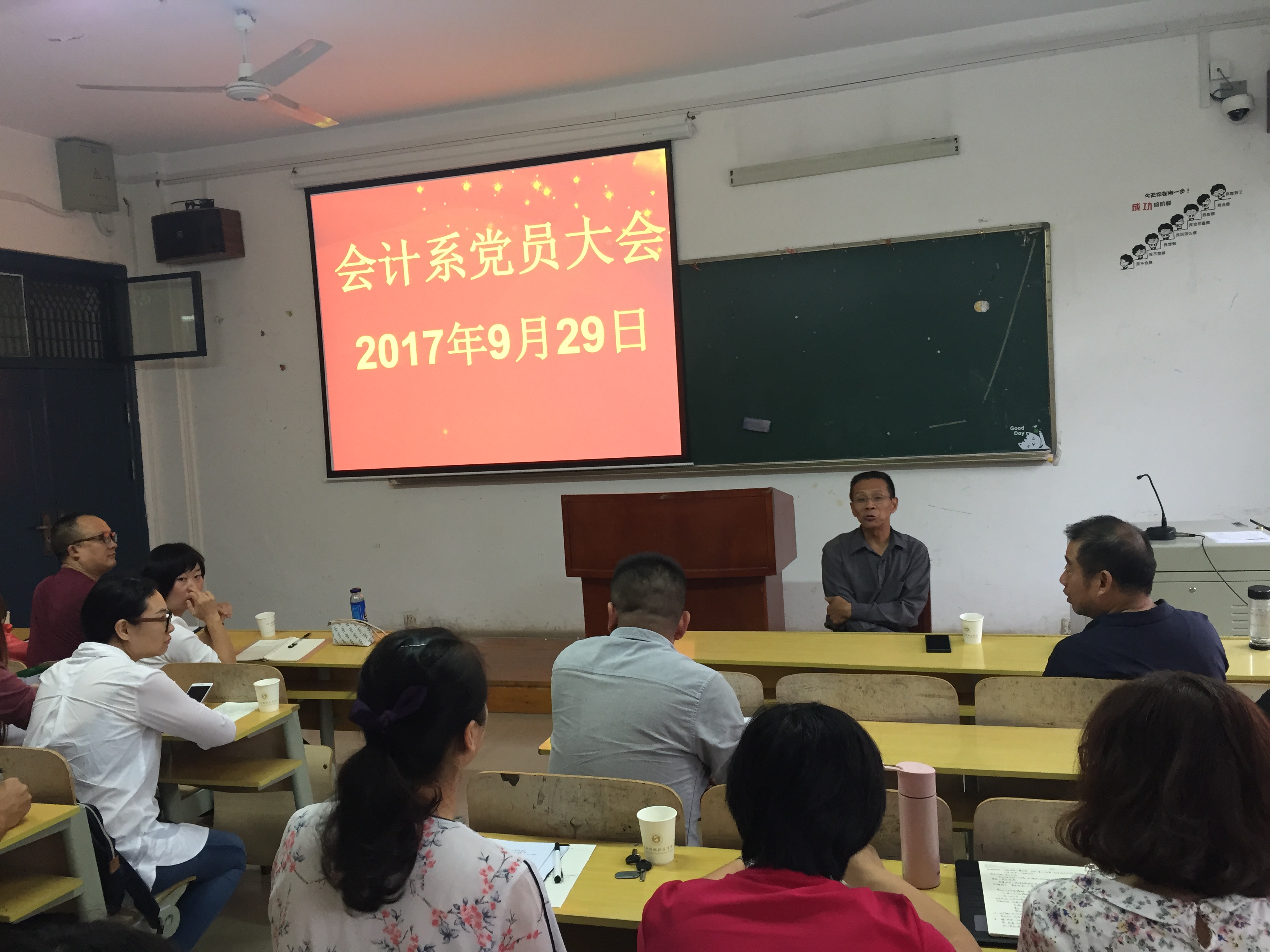 为深入学习贯彻湖北省第十一次党代会精神,努力扩大人民民主,加快建设法治湖北,着力构建深化改革、扩大开放、推动发展、维护稳定的良好民主法治环境,使湖北省第十一次党代会精神在党组织各战线落细落实,根据学院统筹安排,2017年9月29日中午,会计系在学院西区51教室组织系部全体党员召开了以学习湖北省第十一次党代会报告为主题的“书记讲党课”系列会议,出席本次会议的有学院院长张亮、会计系党总支书记阳前林、会计系教师党支部书记杜敏、学生科科长李娟及全体教师党员、学生党员。