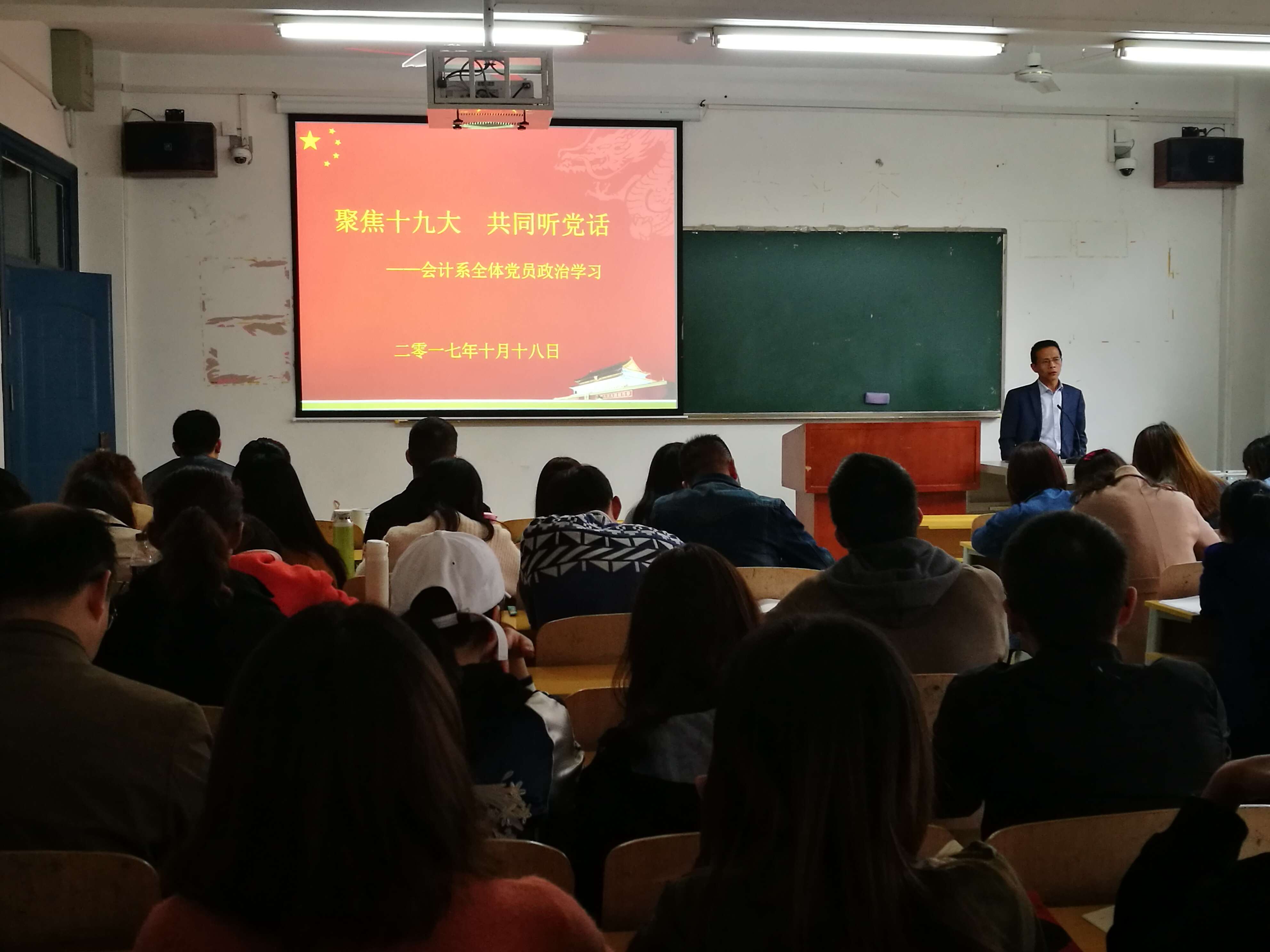 2017年10月18日上午9:00,中国共产党第十九次全国代表大会在人民大会堂开幕。习近平代表第十八届中央委员会向大会作了题为《决胜全面建成小康社会 夺取新时代中国特色社会主义伟大胜利》的报告。为了深入学习党的十九大,2017年10月18日中午,会计系在学院西区51教室组织系部全体党员召开了以学习十八届中央委员会第七次全体会议公报为主题的“聚焦十九大 共同听党话”系列会议,出席本次会议的有学院院长张亮、会计系教师党支部书记杜敏、学生科科长李娟及全体教师党员、学生党员。